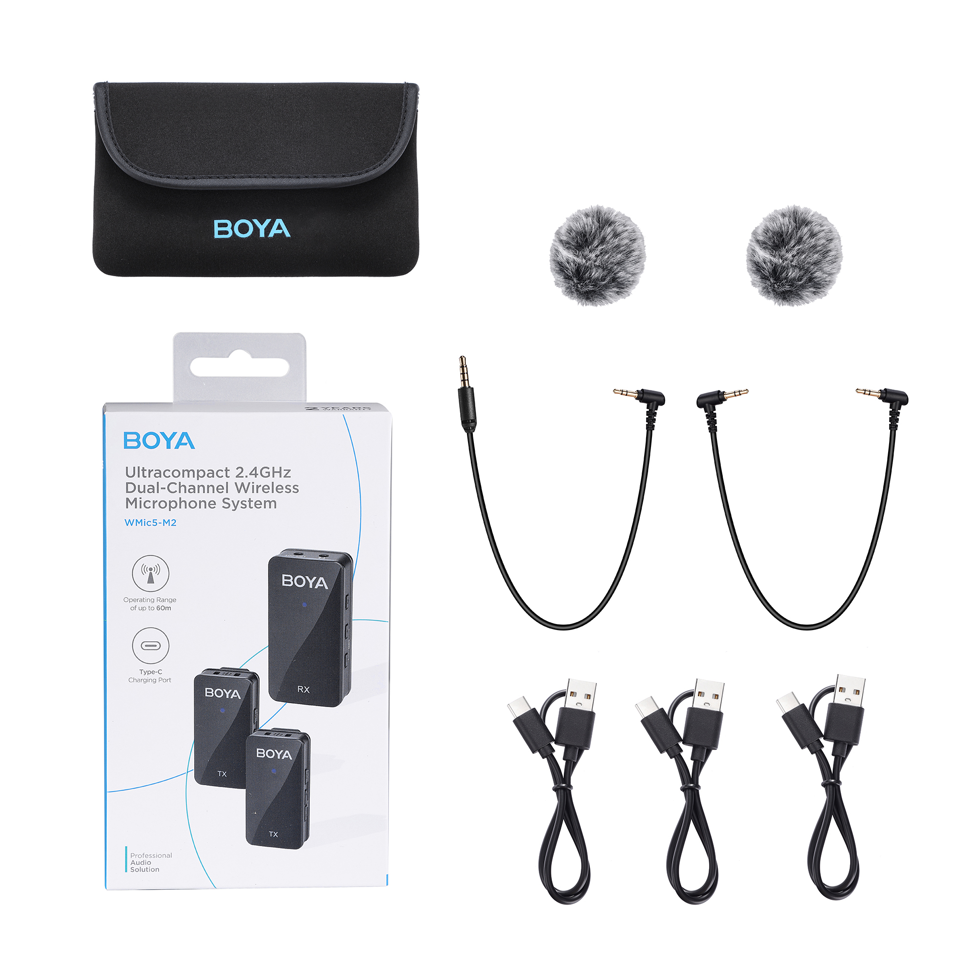 BY-WMic5 serija koristi 2.4GHz ISM tehnologiju bežičnog prenosa za efikasno smanjenje smetnji signala, koja je dizajnirana za besprekorno snimanje kako u zatvorenom tako i na otvorenom. Prijemnik BY-WMic5 M2 je opremljen TRS i TRRS izlaznim kablovima i može se zgodno montirati na kamere ili uređaje sa 3,5 mm priključkom.