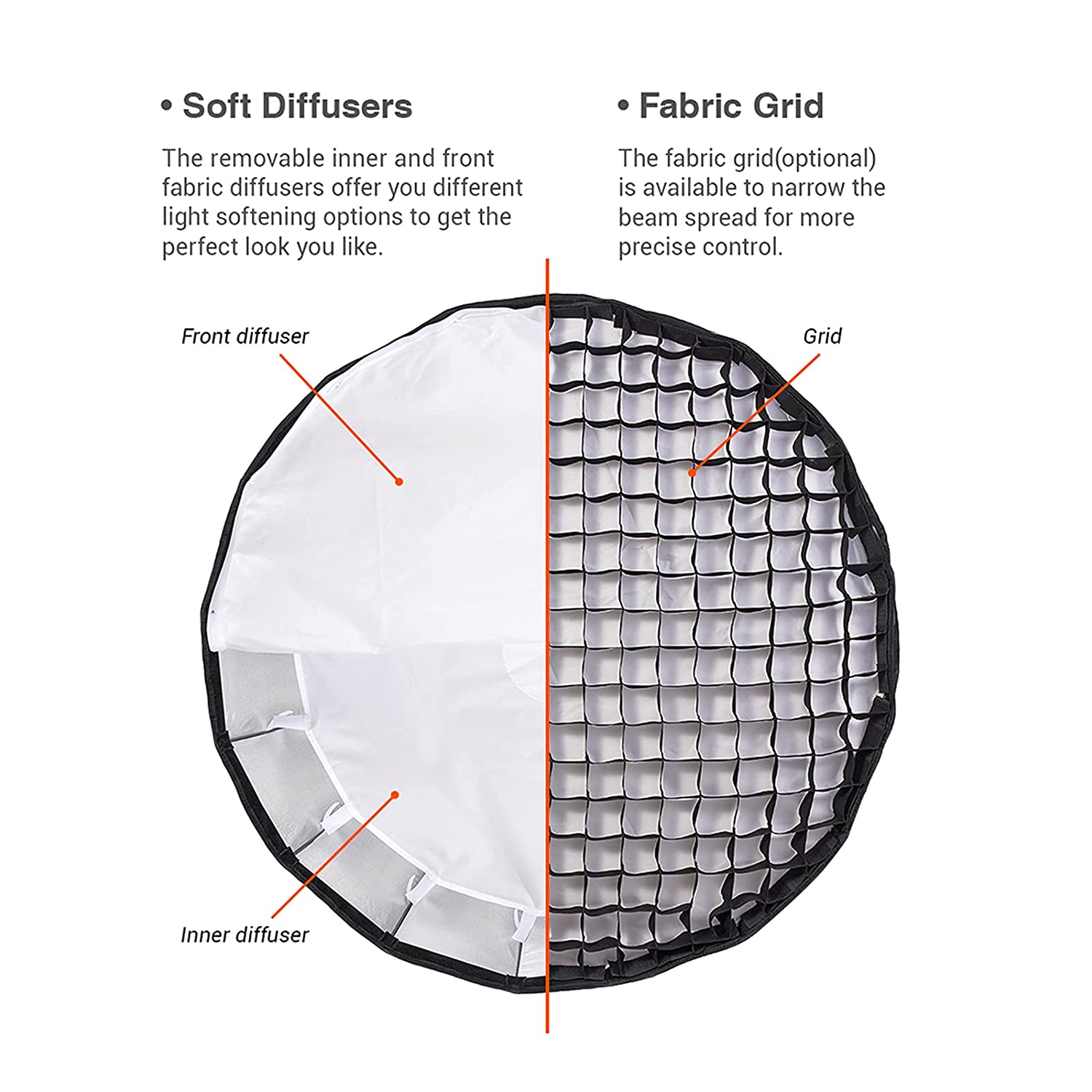 Godox P70G je grid za brzosklopivi QR-P70 parabolic softbox i služi za usmeravanje svetla. Omogućava uži i direktniji snop svetla.